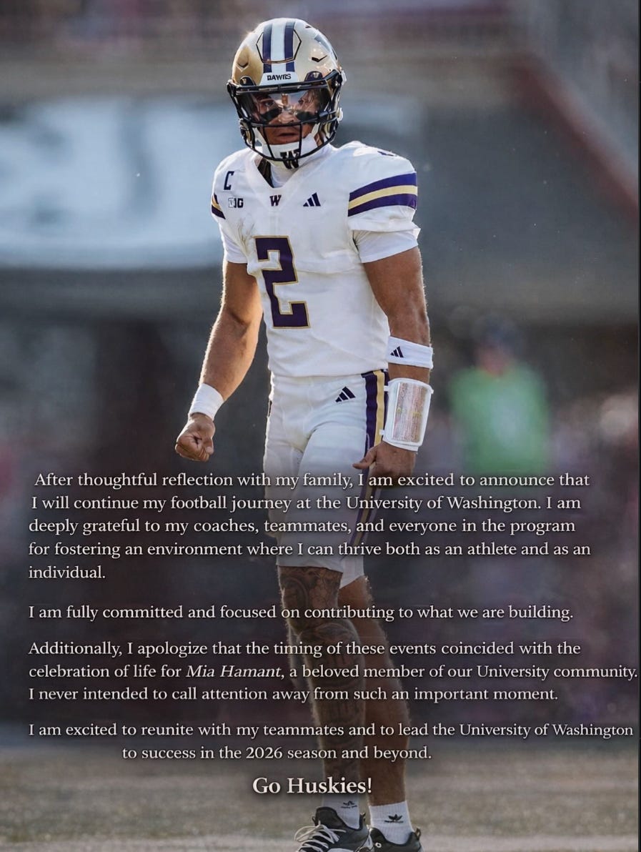 3) The manner and especially timing of the announcement - during Mia Hamant’s celebration of life - were callous and not indicative of a kid who cares about the University of Washington like we do.